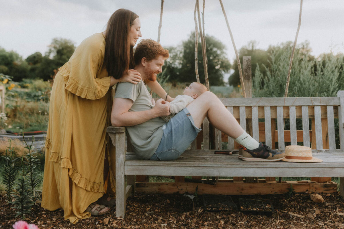 Another session that stayed with me was photographed months later, in summer, in a place that was deeply meaningful to the family. They had a small gardening plot, an allotment where they spent a lot of their ntime together – their happy place. So we waited until the baby was a little older, met among flowers and greenery, and photographed them there. That location told their story far better than any neutral space ever could.
